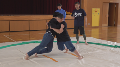 このあと児童たちは縦横4mの簡易土俵の上で「はっけよい」のかけ声に合わせて、立ち合いに臨みました。