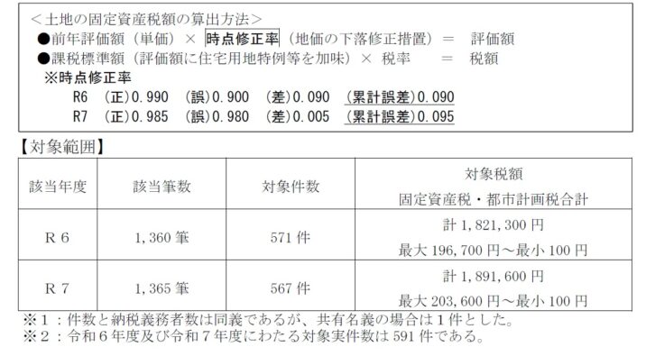 十日町市によりますと、固定資産税や都市計画税の算定にあたり、評価額の算出に用いる標準宅地の時点修正率を誤って入力したため、評価額、課税標準額、税額が過小となる誤りが生じたとしています。対象範囲は令和6年度は571件、1360筆分にのぼり、総額182万1300円。令和7年度は567件、1365筆分にのぼり、総額189万1600円でした。