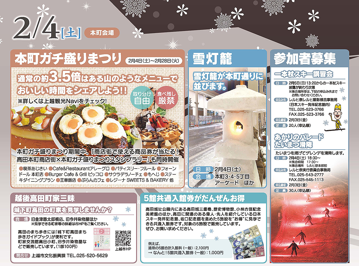 本町商店街では、レルヒ祭期間中に、本町通りに雪灯籠が並ぶほか、旧金津憲太郎桶店や旧今井染物屋など高田の町家を見学できる「越後高田町家三昧」、2月4日(土)~28日(火)の期間、参加店で特盛メニューを提供する「本町ガチ盛りまつり」が行われます。