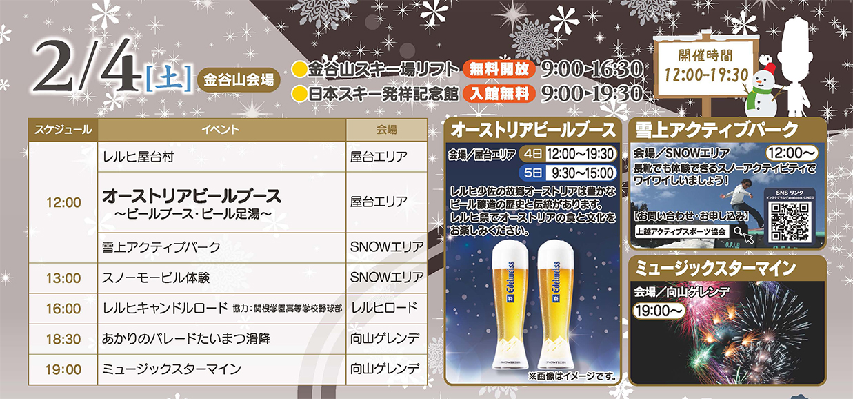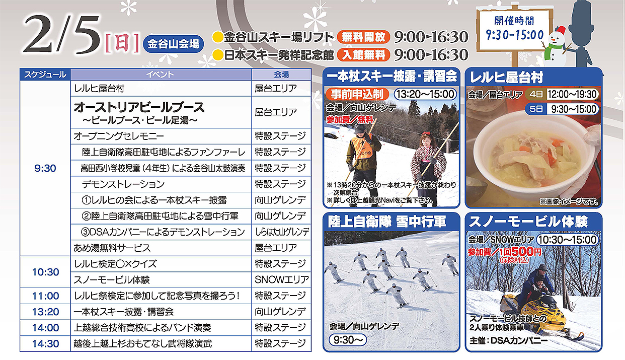 5日(日)は昼からイベントが目白押し。一本杖スキーの披露や陸上自衛隊の雪中行軍、高田西小学校児童による金谷山太鼓演奏など、さまざまな催しが行われる予定です。