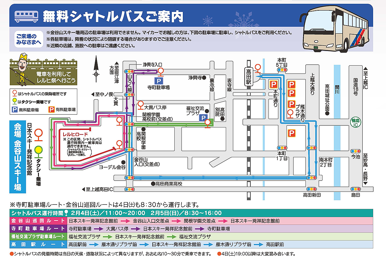 レルヒ祭が行われる2日間は、メイン会場の金谷山スキー場に駐車することができません。会場近くの寺町駐車場や福祉交流プラザといった無料駐車場、高田駅や本町商店街周辺の有料駐車場を利用してください。4日、5日ともに会場と無料駐車場、高田駅前周辺を巡回する無料シャトルバスが運行します。ぜひご利用ください。