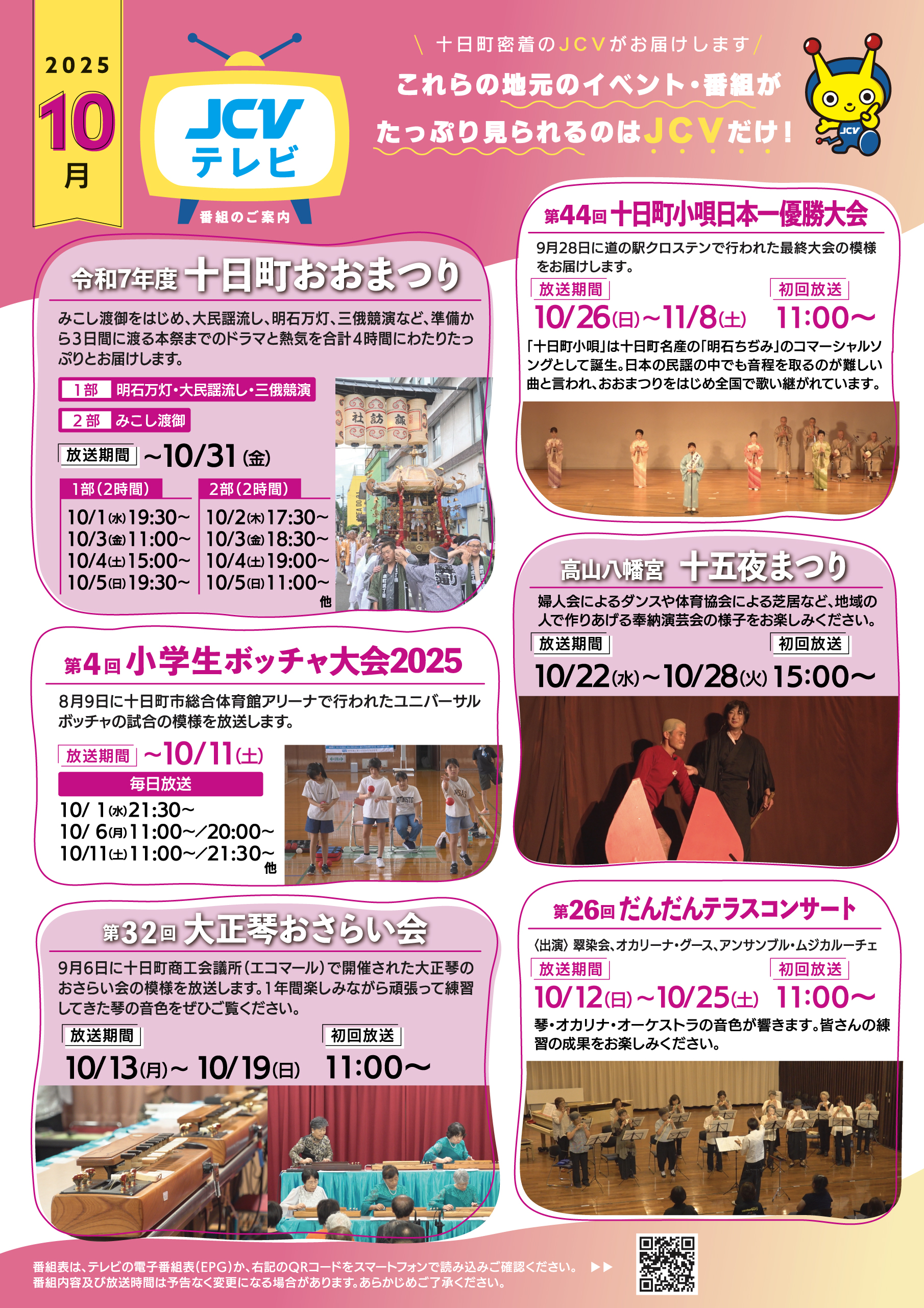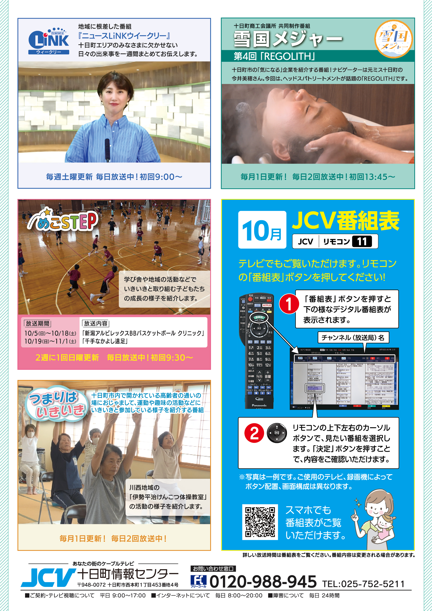 JCV十日町10月放送の番組を紹介します。 ※111ch(リモコン11番)。番組表は、テレビの電子番組表(EPG)をご確認ください。