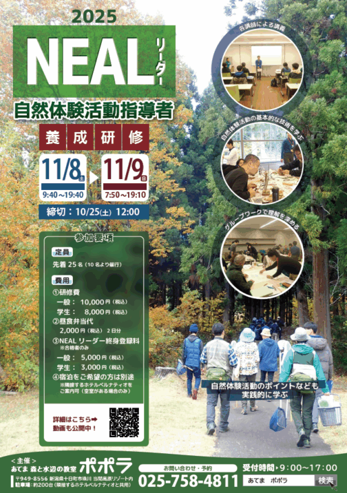 あてま森と水辺の教室ポポラでは「自然体験活動指導者(NEALリーダー)養成研修」を11月8日(土)・9日(日)に開催します。現在参加者を募集しています。