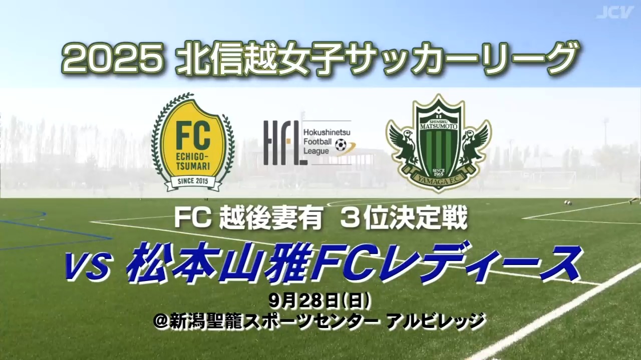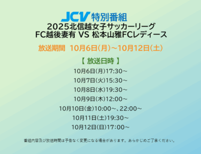 JCVでは、9月28日(日)に行われた北信越女子サッカーリーグの「FC越後妻有 対 松本山雅FCレディース」戦を10月6日(月)初回放送17:30~放送します。JCV番組はリオンドール十日町店内のJCVPRセンター、または本町通りのとや店舗内等でもご覧いただけます。