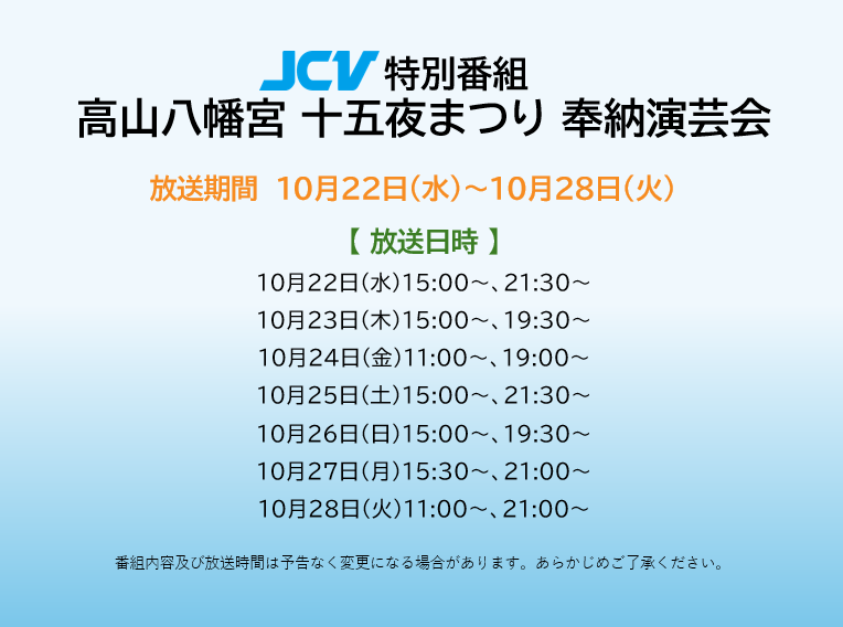 JCVでは、今年9月13日(土)に開催された、「高山八幡宮 十五夜まつり 奉納演芸会」の模様を10月22日(水)から特別番組で放送しています。現在JCV111チャンネルで放送中です。JCV番組はリオンドール十日町店内のJCVPRセンター、または本町通りのとや店舗内等でもご覧いただけます。