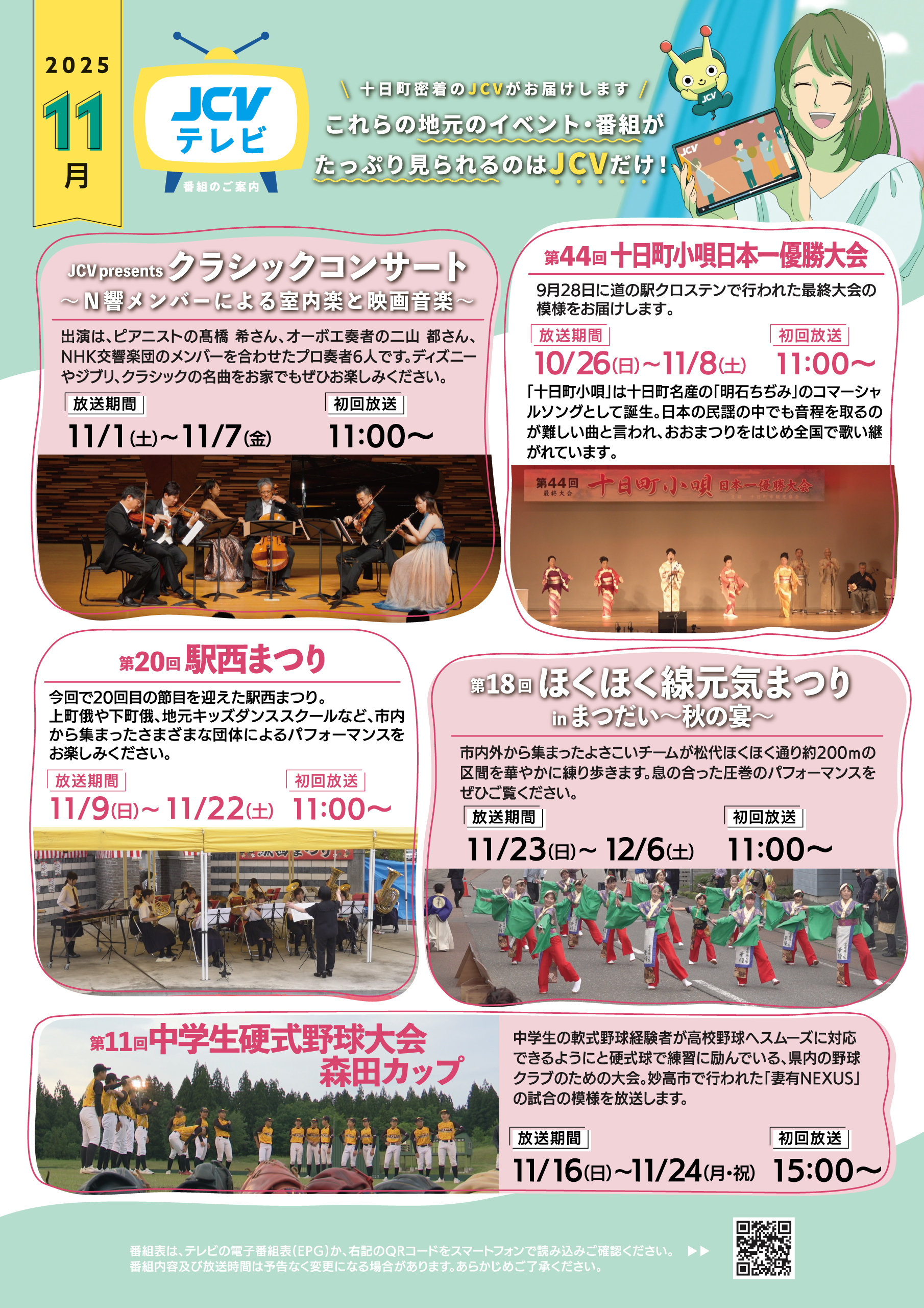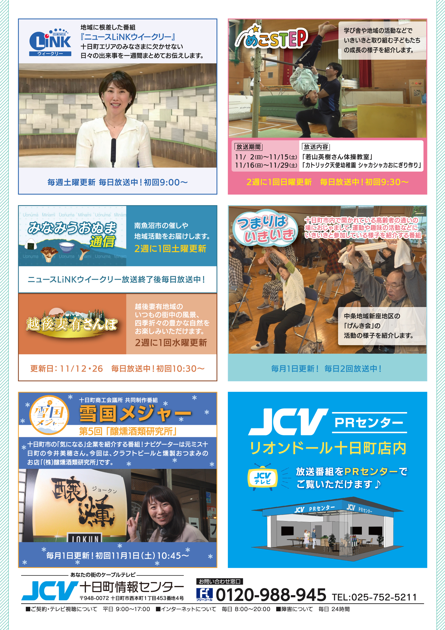 JCV十日町11月放送の番組を紹介します。 ※111ch(リモコン11番)。番組表は、テレビの電子番組表(EPG)をご確認ください。