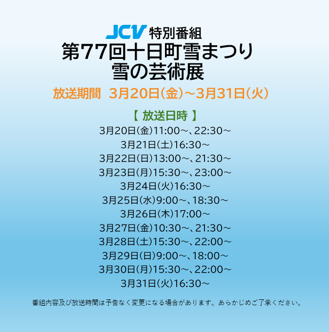 今年2月20日(金)から3日間開催された、第77回十日町雪まつり。JCVでは、雪の芸術展の作品を一挙に放送します。現在JCV111チャンネルで放送中です。JCV番組はリオンドール十日町店内のJCVPRセンター、または本町通りのとや店舗内等でもご覧いただけます。