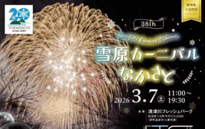 「第38回雪原カーニバルなかさと」が3月7日(土)に清津川フレッシュパークで開催されます。 新市誕生20周年記念事業とし…